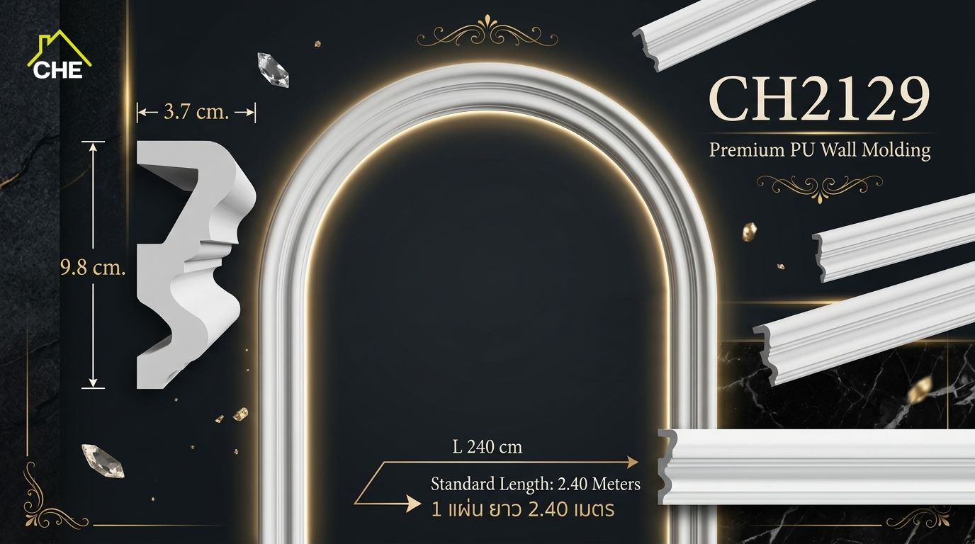 รุ่น CH2129 เป็นบัวลายเรียบที่บางเเต่ให้ลายเส้นตรงกลางขนาดเล็กเเต่ก็ชัดเพียงพอสำหรับการการใช้ตกแต่งกรอบผนังหรือซุ้มประตู โดยยังคงความเรียบร้อยเข้ากับบ้านได้หลายสไตล์