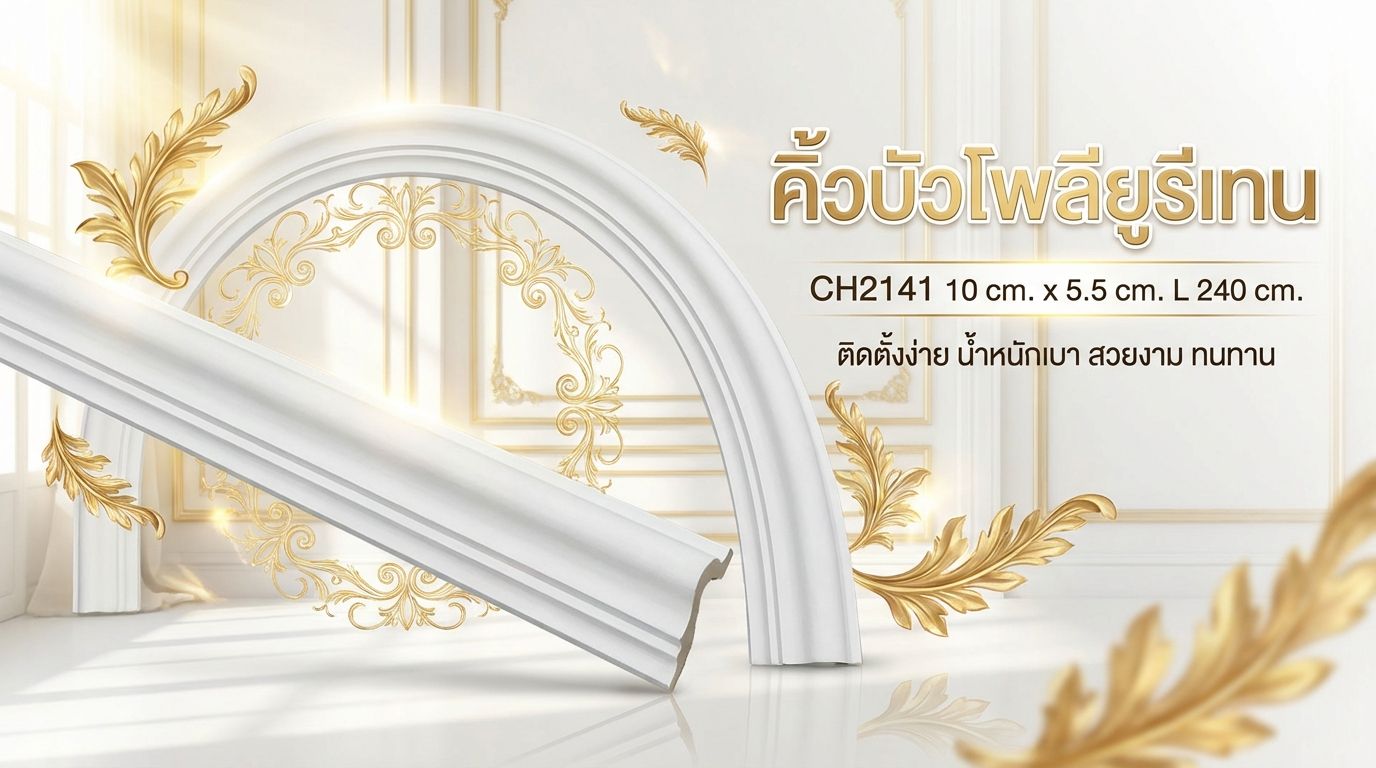 คิ้วบัวรุ่น CH2141 ผลิตจาก โพลียูรีเทน (PU) ซึ่งเป็นวัสดุสามารถใช้งานได้ทั้งการตกแต่งภายในและภายนอก มีคุณสมบัติที่เหมาะกับการใช้งานระยะยาว ซ่อมได้โป๊วผิวทำสีใหม่ได้ ทำให้รีโนเวทซ่อมเเซมให้ดูใหม่เป็นช่วงๆ 3-5ปีได้