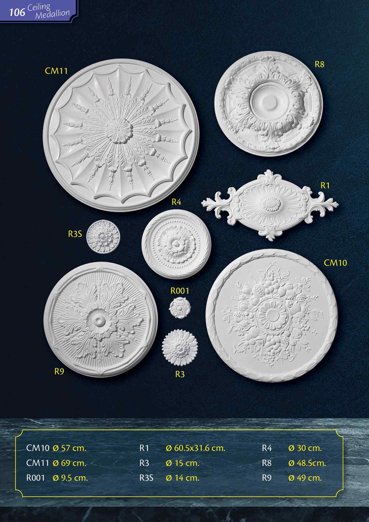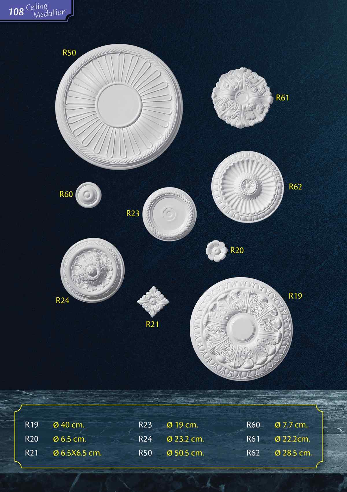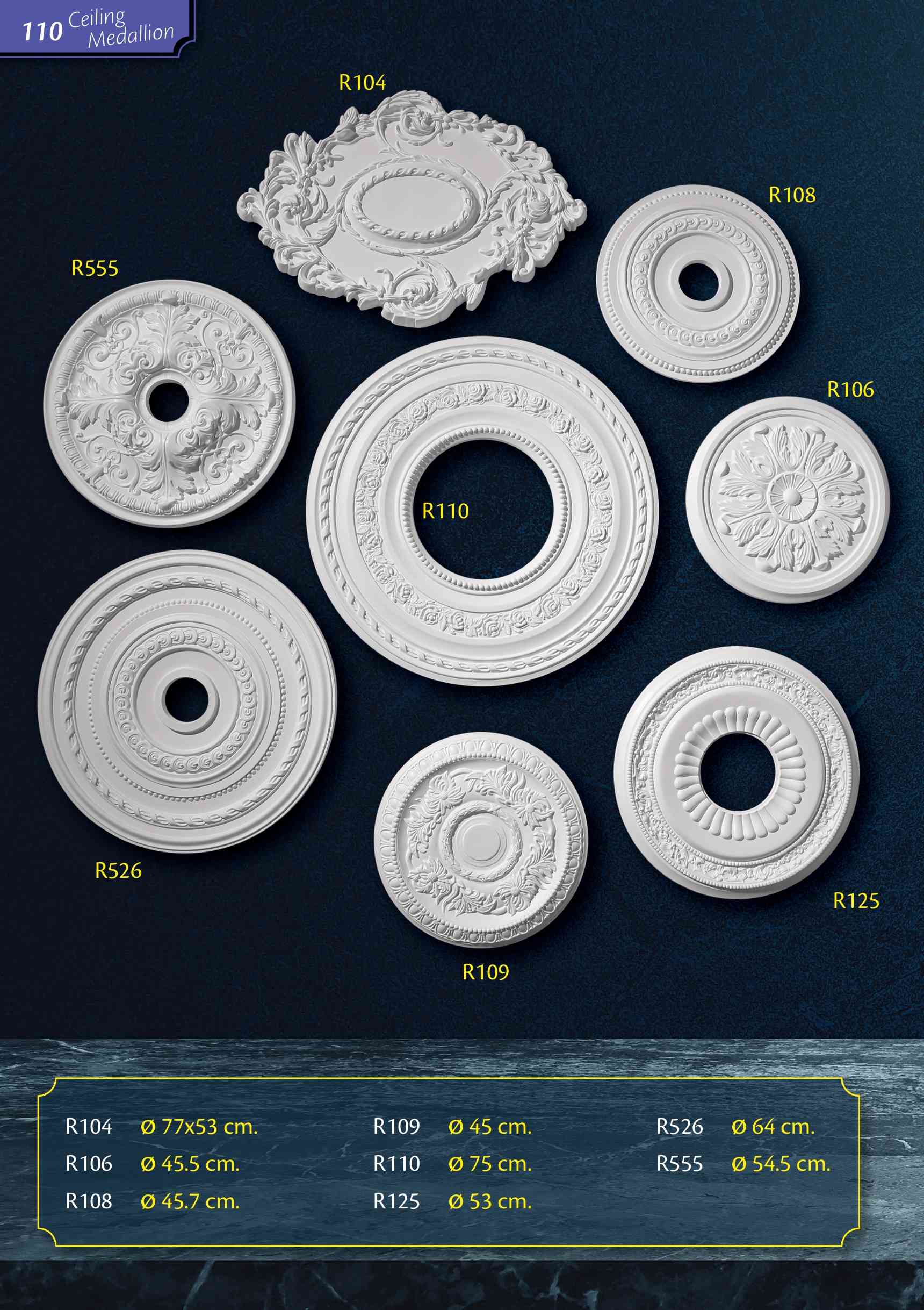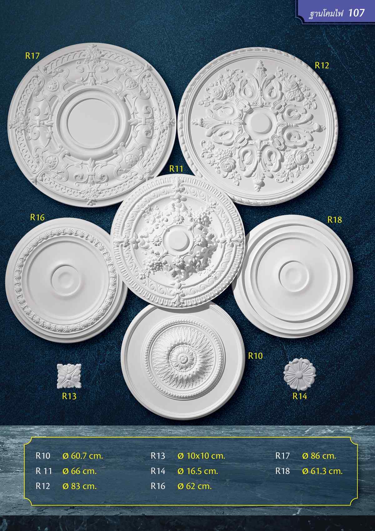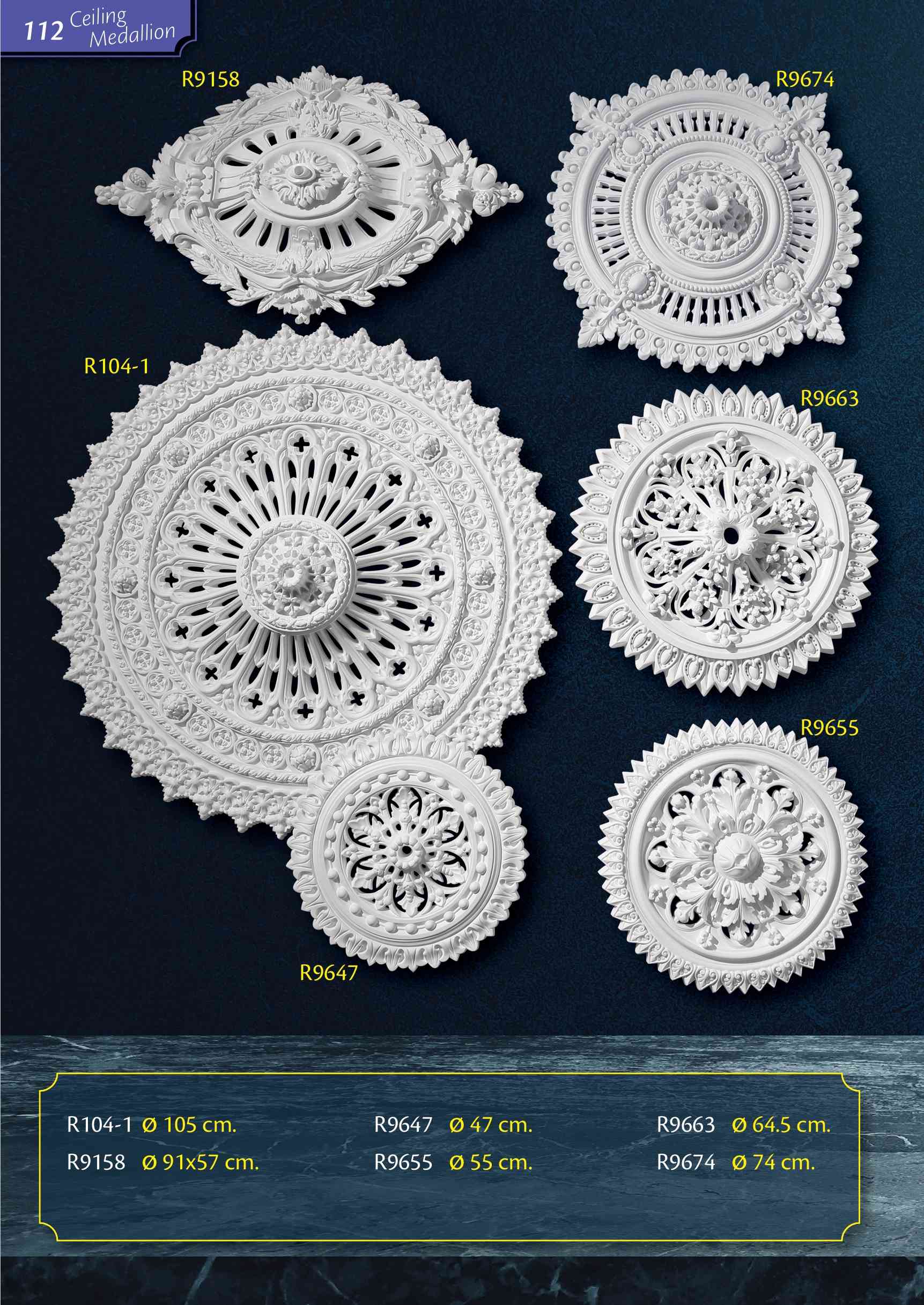 "ceiling medallions" เป็นชื่อเรียกฐานโคมไฟของเรา ซึ่งสามารถเจาะโดยใช้เครื่องมือไม้มาตรฐานทั่วไป ใช้สำหรับการตกแต่งห้องตามปกติหรือติดร่วมกับการเดินสายไฟฟ้าด้านบน เช่น กรณีติดร่วมกับโคมไฟหรือพัดลมเพดาน จุดเด่นสำคัญคือมีน้ำหนักเบาทำให้ง่ายต่อการนำไปติดตั้ง และเป็นงานสำเร็จรูปที่พร้อมสำหรับทำสีตามที่คุณต้องการ