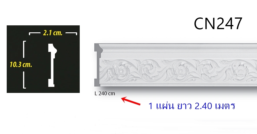 บัวผนัง ตกแต่งสไตล์หลุยส์ รหัส CN247 คิ้วบัว PU ลายแกะสลักสวย ปลวกไม่กิน ทำสีได้ รุ่นที่นิยมใช้คาดกลางผนัง ขนาดหน้ากว้างประมาณ 10cm. (4นิ้ว) ใช้ติดขอบหลุมฝ้าเป็นกรอบ หรือติดทับขอบวงกบ
